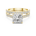 A striking gold ring featuring a bold princess-cut center framed by twin pavé bands. Perfectly blending geometry and glamour, this piece radiates contemporary luxury and timeless allure...