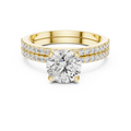 A timeless gold ring highlighted by a magnificent round center and twin pavé bands. Embodying understated luxury, this piece is ideal for everyday elegance or celebrating special milestones..