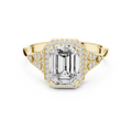 An emerald‑cut lab grown diamond sits in a pavé halo with filigree lattice and geometric side details, all in polished white gold. The open under‑gallery adds light; the slim band keeps it graceful. A vintage‑inspired statement with crisp lines and brilliant sparkle..