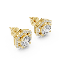 These distinctive earrings feature a sparkling round lab-grown diamond centrally placed and held by six prongs, surrounded by a geometric hexagonal halo encrusted with smaller lab-grown diamonds. The hexagon design introduces a modern architectural element, intensifying brilliance while offering a unique twist on classic halo earrings. Perfect for trendsetters who embrace sustainable elegance and bold style statements.