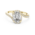 An oval lab grown diamond sits in a delicate halo with a twisting pavé band that sweeps around the center, all in polished white gold. The open gallery lets in light for strong sparkle. A graceful, modern take on the halo with fluid lines and everyday comfort..