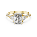 A radiant‑cut lab grown diamond is flanked by pear‑shaped side stones and slim pavé shoulders, all in polished white gold. The open gallery brings in light for strong sparkle, while the tapered band keeps it comfortable. A clean, modern three‑stone design with extra shimmert