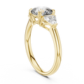 A refined three-stone ring with a cushion-cut center and brilliant trapezoid side stones, set in luminous yellow gold. This elegant design celebrates balance, unity, and contemporary sophistication—perfect for marking special milestones..