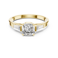 A round lab grown diamond with sleek tapered baguette side stones on a polished white‑gold band. Clean, balanced lines and bright sparkle. Classic three‑stone look with modern height and everyday comfort—ideal for proposals or a refined gift with ethical shine